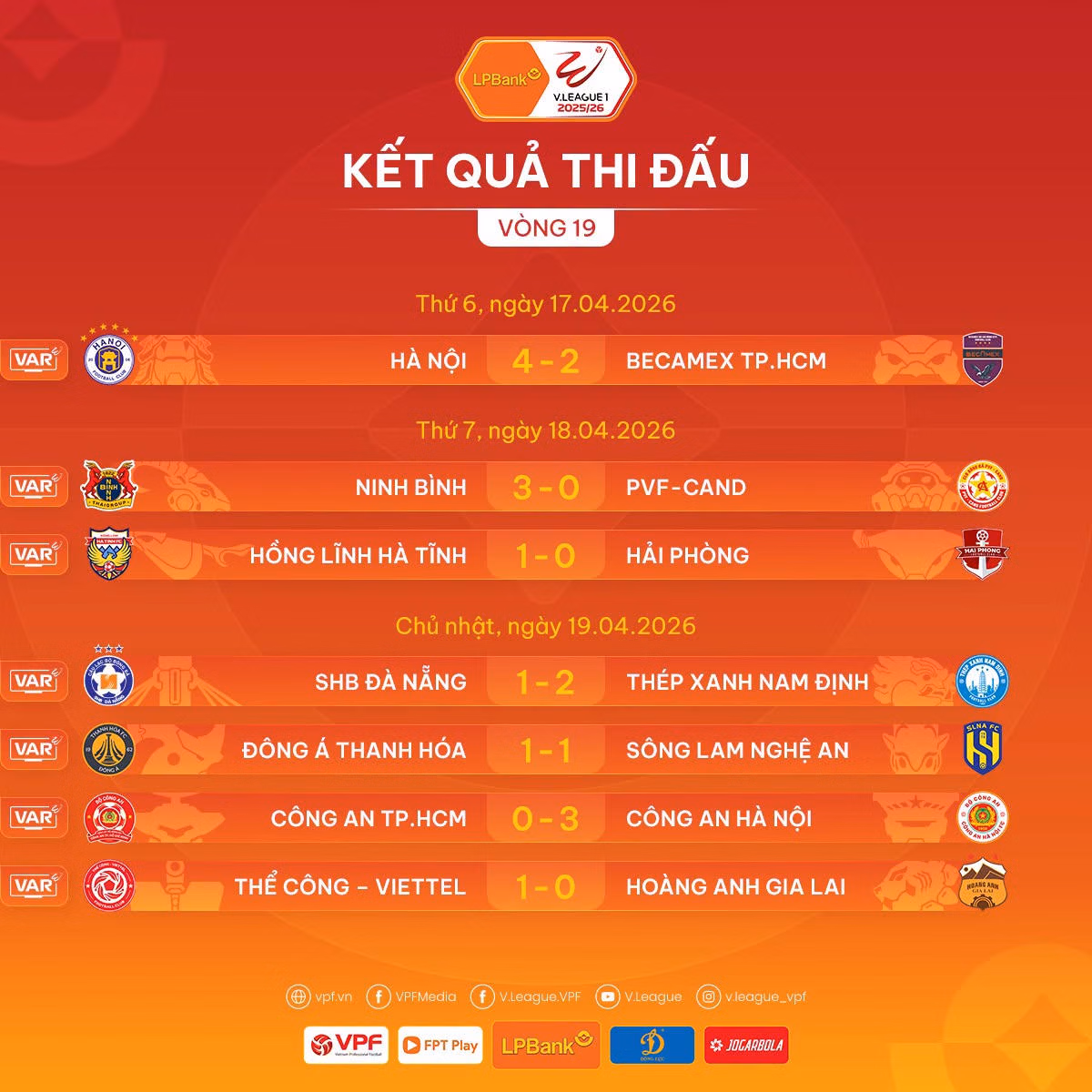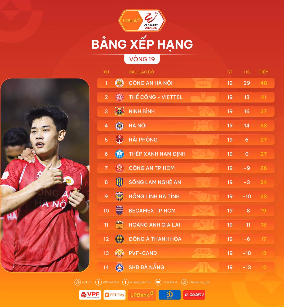 Vòng 19 V.League 2025/26 chứng kiến cuộc đua nóng bỏng và gay cấn ở nhóm trên của bảng xếp hạng, khi các đội ganh đua nhau quyết liệt với cách biệt điểm số chỉ trong gang tấc.