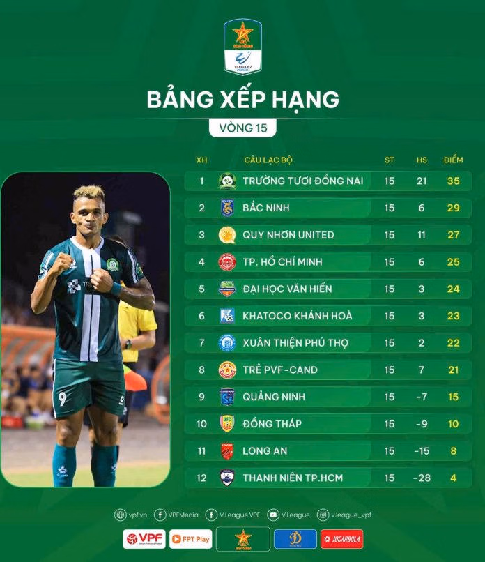 Với 35 điểm trong tay, Đồng Nai tạo ra khoảng cách 6 điểm với đối thủ bám đuổi phía sau. CLB Bắc Ninh đã trở lại vị trí thứ 2 sau khi giành chiến thắng 1-0 trước Đồng Tháp.