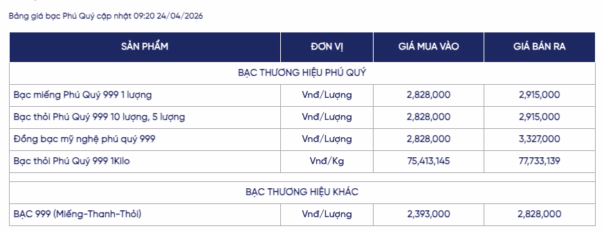 Ở phân khúc bạc miếng, giá bạc Phú Quý 999 hiện được niêm yết tại 2,82 triệu đồng/lượng (mua vào) và 2,91 triệu đồng/lượng (bán ra). Trong khi đó, bạc thỏi 999 loại 1kg của thương hiệu này được giao dịch ở mức 75,4 – 77,7 triệu đồng/kg.
