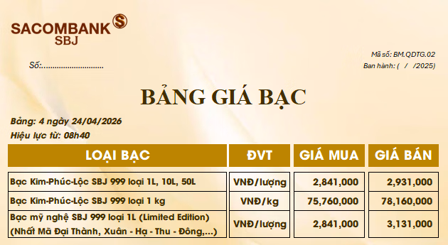 Công ty Vàng bạc – Đá quý Sacombank (SBJ) niêm yết giá bạc mua vào 2,84 triệu đồng/lượng, bán ra 2,93 triệu đồng/lượng. Đối với bạc thỏi 999 loại 1kg, thương hiệu này cũng ghi nhận mức giảm, hiện giao dịch tại 75,7 – 78,1 triệu đồng/kg.