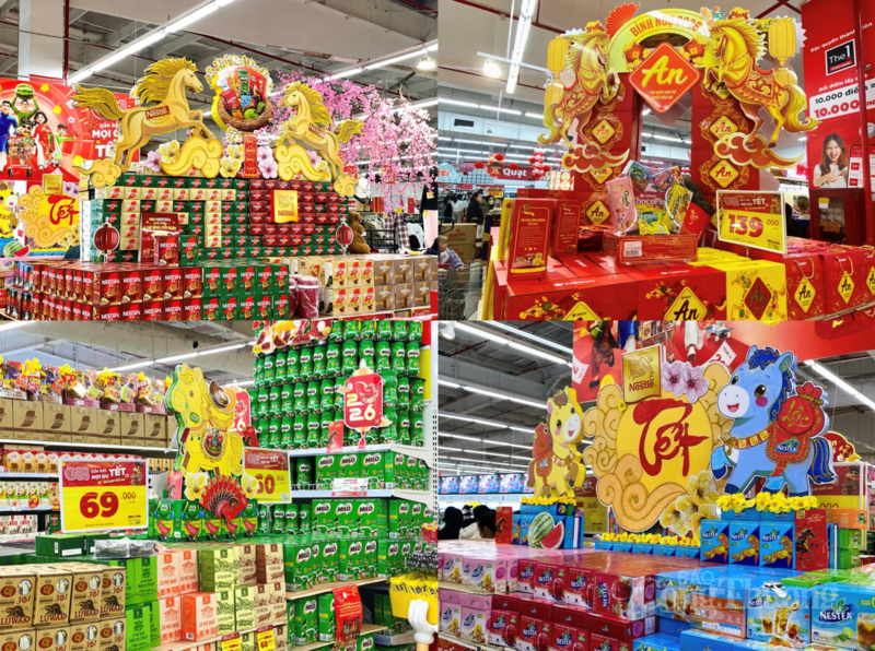 Các hệ thống siêu thị lớn như GO! Thăng Long, Co.opmart, Mega Market, WinMart cũng triển khai nhiều chương trình khuyến mại nhằm thu hút khách mua sắm Tết. Tại hệ thống siêu thị GO!, các chương trình ưu đãi được tổ chức đồng loạt, liên tục từ cuối tháng 12/2025 đến Tết Nguyên đán Bính Ngọ 2026, áp dụng cho nhiều nhóm hàng như thực phẩm, bánh kẹo, đồ uống, đồ gia dụng và quà biếu. Trong đó, nhiều sản phẩm tẩy rửa và đồ dùng gia đình được giảm giá lên tới 43%, kèm các quà tặng thiết thực.