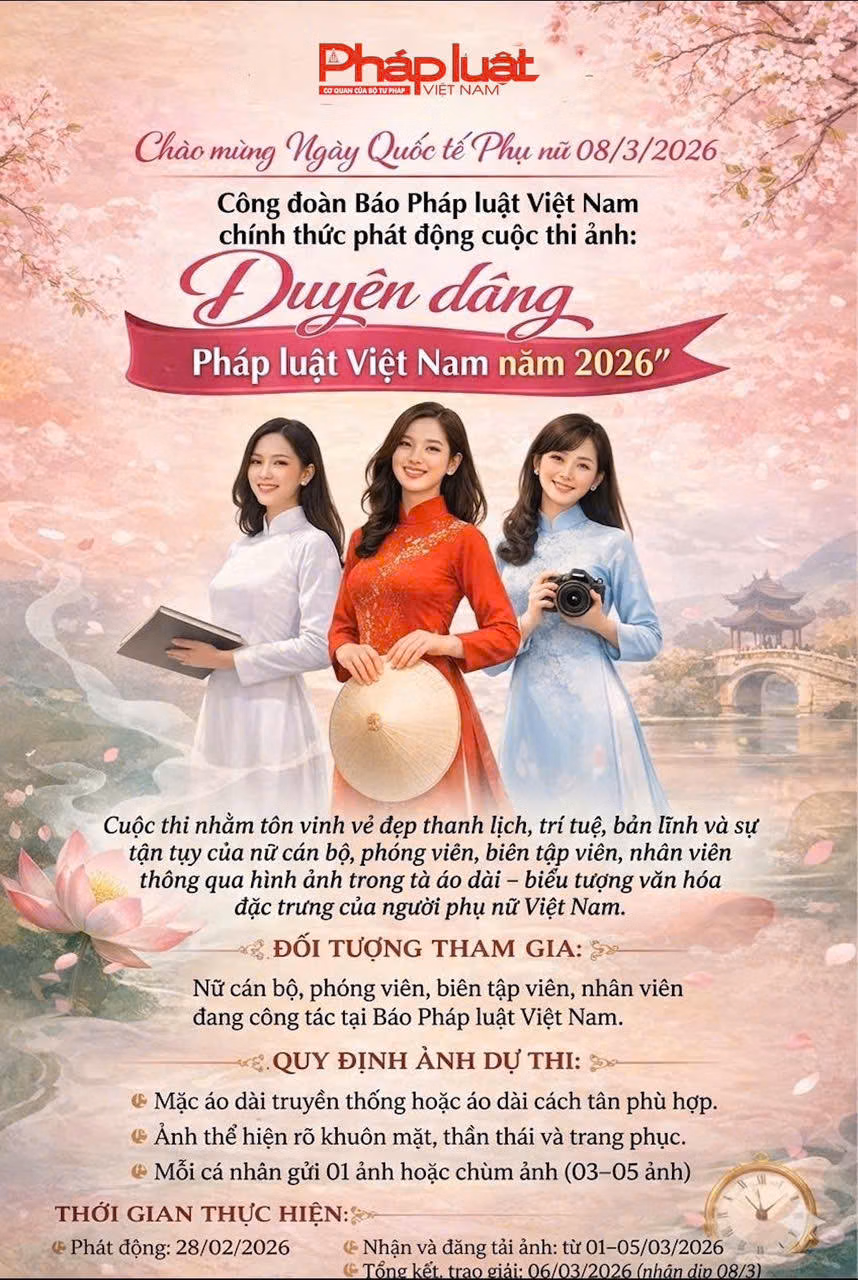 Nhằm tôn vinh vẻ đẹp thanh lịch, trí tuệ và bản lĩnh của nữ cán bộ, phóng viên, biên tập viên, nhân viên Báo Pháp luật Việt Nam thông qua hình ảnh trong áo dài, Công đoàn Báo PLVN phát động cuộc thi ảnh “Duyên dáng Pháp luật Việt Nam năm 2026” dành cho nữ cán bộ, phóng viên, biên tập viên, nhân viên đang công tác tại Báo Pháp luật Việt Nam.