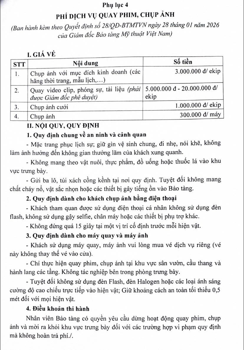 Với mong muốn lưu giữ không gian thưởng lãm nghệ thuật trang nghiêm và bảo tồn tối ưu các hiện vật, Bảo tàng Mỹ thuật Việt Nam mới phát hành Thông báo về quy định và biểu phí dịch vụ quay phim, chụp ảnh tại bảo tàng từ 1/2/2026.