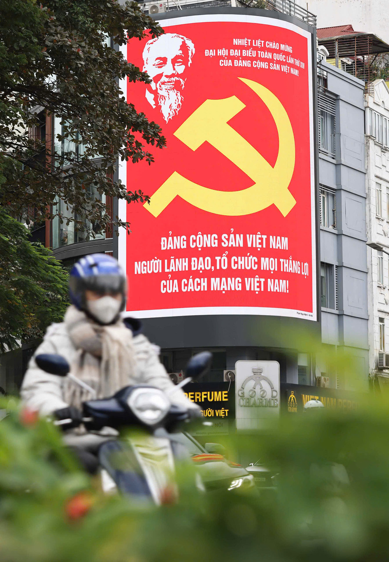 Hình ảnh Chủ tịch Hồ Chí Minh gắn với biểu trưng Đại hội Đảng XIV được đặt trang trọng trên mặt tiền khu vực Tràng Tiền, góp phần lan tỏa không khí chào mừng sự kiện chính trị trọng đại của đất nước.