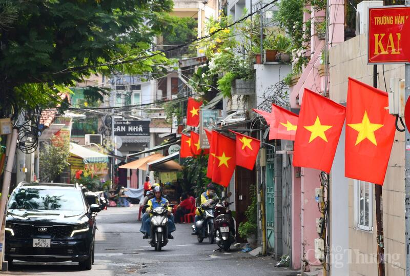 Cờ đỏ sao vàng được treo khắp nơi trên các nẻo đường của TP. Hồ Chí Minh tạo nên một không khí đầy trang trọng, vui tươi. Ảnh: Thanh Minh.