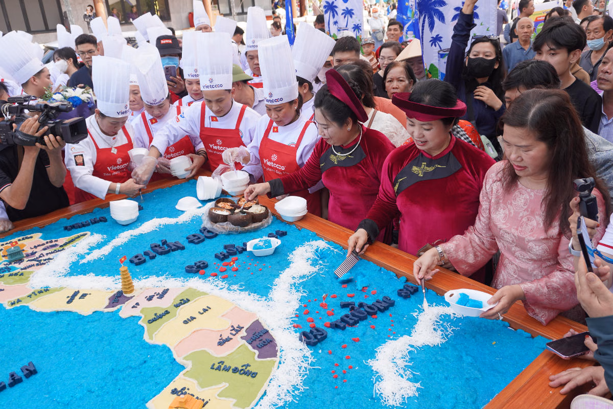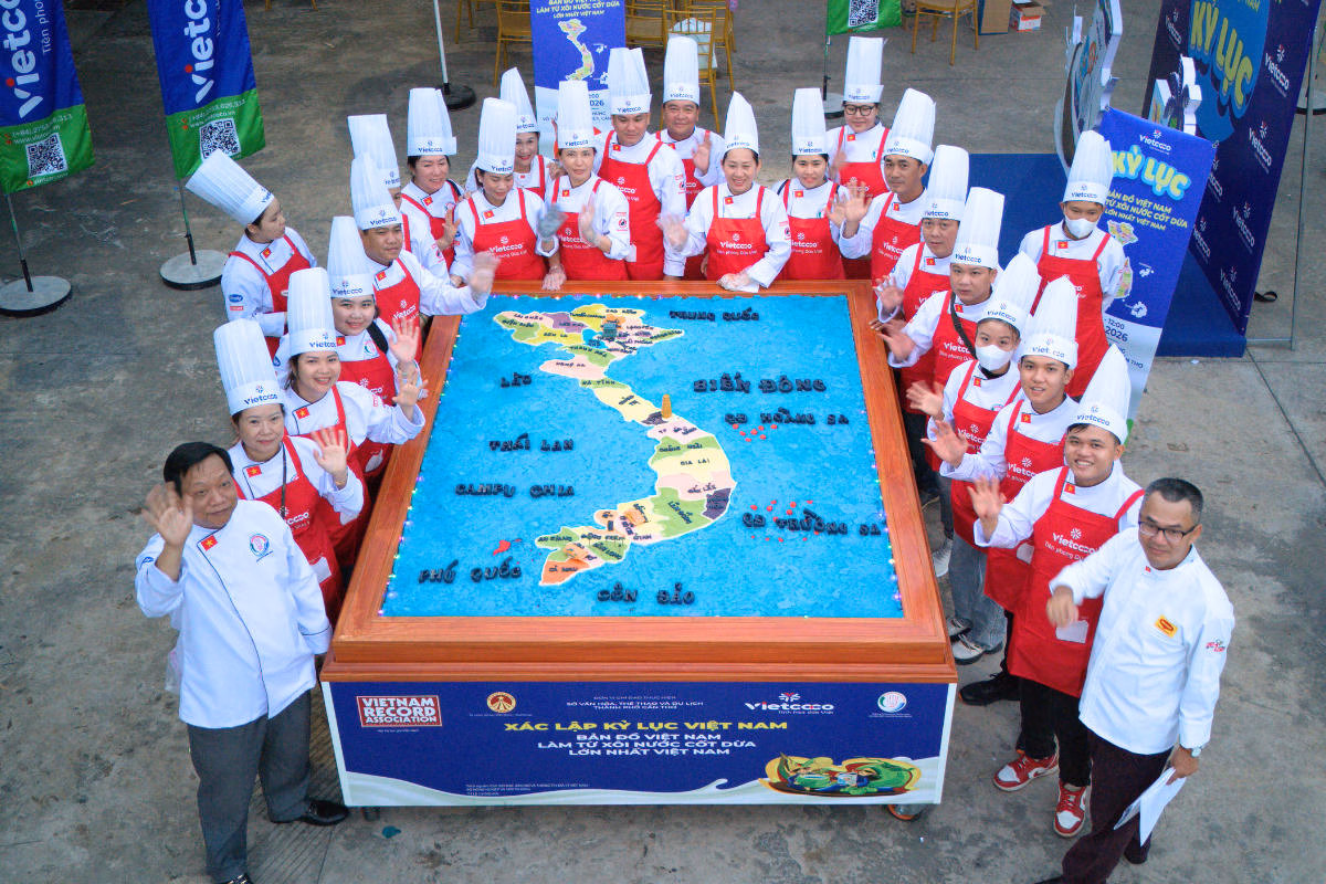 Trong khuôn khổ nỗ lực quảng bá tinh hoa ẩm thực và nâng tầm giá trị nông sản Việt, 103 đầu bếp chuyên nghiệp đã cùng nhau tạo nên tác phẩm “Bản đồ xôi nước cốt dừa lớn nhất Việt Nam”. Công trình nghệ thuật ẩm thực độc đáo này vừa được Tổ chức Kỷ lục Việt Nam (VietKings) chính thức công nhận kỷ lục vào ngày 26/04/2026 nhằm ngày mùng 10 tháng 03 âm lịch.